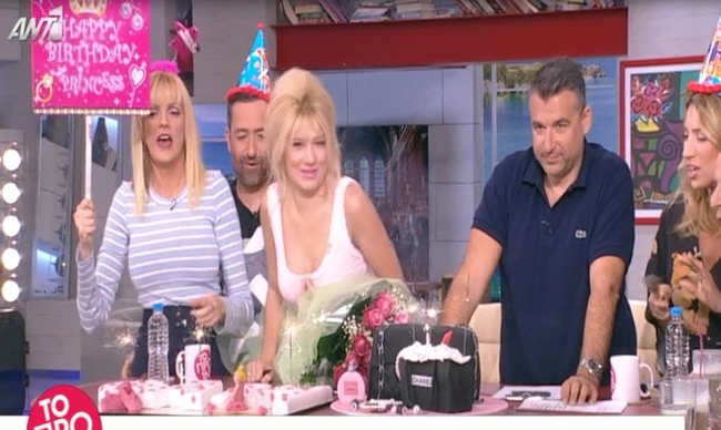 Έβαλε ένα λευκό φόρεμα με βαθύ ντεκολτέ και εμφανίστηκε στην εκπομπή «Το πρωινό», όπου την περίμενε μία έκπληξη από τους συνεργάτες της. Της έφεραν μία τούρτα υπερπαραγωγή και εκείνη έσβησε το κεράκι… Όμως ο ξινός της παρέας, ο Γιώργος Λιάγκας ούτε φωτογραφία ήθελε να βγάλουν, ούτε να φιλήσει τη γυναίκα του τη Φαίη!
