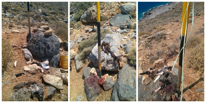 "Εδώ είμαι στο μονοπάτι Ε4 στην περιοχή τραπέζια και όπως βλέπετε κάποιοι λίγο πριν σκότωσαν δύο ρίφια τα κρέμασαν στο στύλο του Ε4 τα έγδαραν και άφησαν πάνω στο μονοπάτι τα άντερα τις προβιές τα αίματα πάνω στο βράχο !!!"