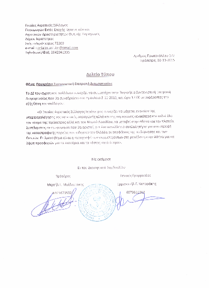 «Ο Ενιαίος Αγροτικός Σύλλογος Ιεράπετρας συνεχίζει να μάχεται εναντίον της υπερφορολόγησης της αγροτικής παραγωγής αλλά και της παραγωγής γενικότερα και καλεί όλο τον κόσμο της Ιεράπετρας αλλά και του Νομού Λασιθίου, να μεταβεί στην Αθήνα και την πλατεία Συντάγματος σε ημερομηνία που θα οριστεί, για ένα πανελλήνιο συλλαλητήριο για αντιστροφή της καταστροφικής πορείας που οδηγούν την Ελλάδα οι αποφάσεις της κυβέρνησης και των θεσμών. Επόμενο βήμα είναι η καταγραφή των συμμετεχόντων στη μετάβαση στην Αθήνα για να λήψη προσφορών για τα εισιτήρια και το κόστος κατά άτομο».