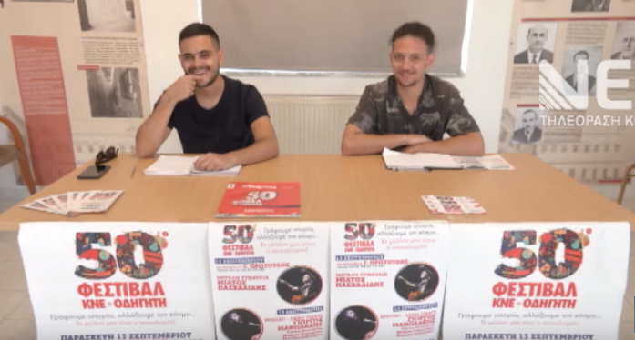 Στο πρώην στρατόπεδο Μαρκοπούλου Παρασκευή 13 και Σάββατο 14 Σεπτέμβρη θα διεξαχθούν οι εκδηλώσεις του 50ου Φεστιβάλ ΚΝΕ-ΟΔΗΓΗΤΗ στα Χανιά. Περιλαμβάνουν ομιλία από το μέλος του Πολιτικού Γραφείου της ΚΕ του ΚΚΕ Γιάννη Πρωτούλη , συναυλίες με τον Μίλτο Πασχαλίδη και Κρητικούς καλλιτέχνες καθώς και πλήθος δράσεων . Ας παρακολουθήσουμε τις σχετικές δηλώσεις .