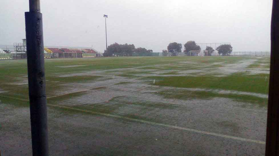 Οι καιρικές συνθήκες στην Κρήτη, είναι πολύ κακές με βροχή και δυνατό αέρα, ενώ το γήπεδο του Μάλεμε, όπως φαίνεται και απο την φωτογραφία που ανέβασε η ΠΑΕ ΟΦΗ 1925 στην επίσημη ιστοσελίδα της, έχει μετατραπεί σε λίμνη.