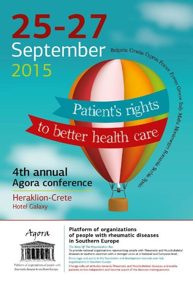 Ο Σύλλογος Ρευματοπαθών Κρήτης, ως ιδρυτικό μέλος της AGORA* (από το 2008) καθώς και μέλος του διοικητικού συμβουλίου της, έχει την εξαιρετική τιμή να διοργανώνει το ετήσιο συνέδριο της AGORA για το 2015. Το συνέδριο θα πραγματοποιηθεί στις 24-27 Σεπτεμβρίου 2015 στο Ηράκλειο, στο ξενοδοχείο GALAXY και για φέτος έχει τον τίτλο «Patients? Rights to Better Health Care: Highlighting the different approaches for treating RMDs» («Τα δικαιώματα των ασθενών για καλύτερη περίθαλψη: υπογραμμίζοντας τις διαφορετικές προσεγγίσεις στην θεραπεία των ρευματικών νοσημάτων»). Το συνέδριο παρουσιάζει εξαιρετικό ενδιαφέρον καθώς συμμετέχουν Σύλλογοι ασθενών της νοτίου Ευρώπης, που αντιμετωπίζουν κοινά προβλήματα και ανάλογες προκλήσεις εξαιτίας της οικονομικής κρίσης και της συνεχιζόμενης ύφεσης.