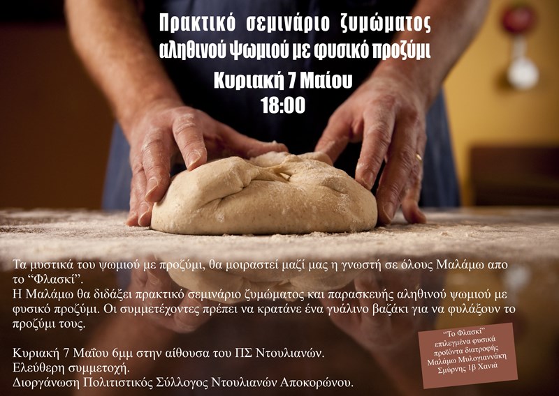 Η Μαλάμω θα διδάξει πρακτικό σεμινάριο ζυμώματος και παρασκευής αληθινού ψωμιού με φυσικό προζύμι. Οι συμμετέχοντες πρέπει να κρατάνε ένα γυάλινο βαζάκι για να φυλάξουν το προζύμι τους.