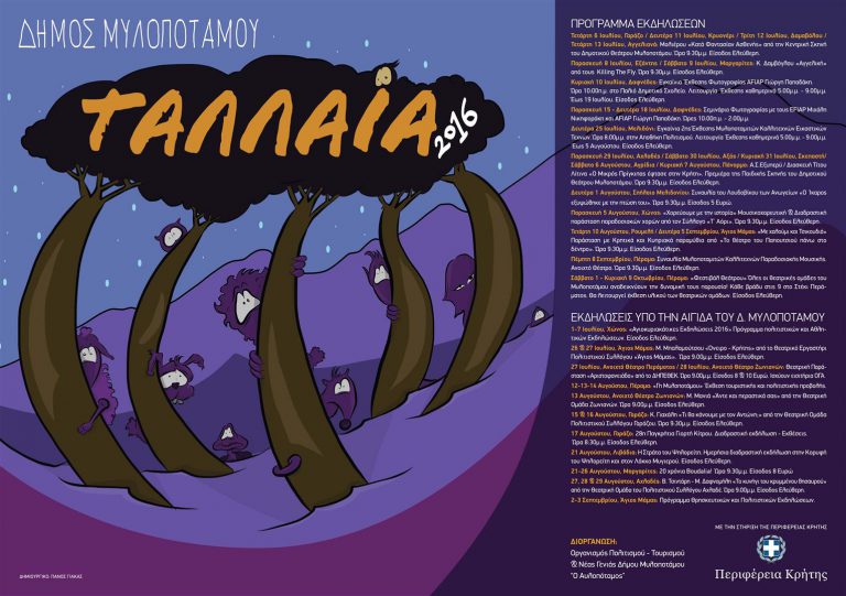 Με την στήριξη της Περιφέρειας Κρήτης το πολιτιστικό φεστιβάλ «ΤΑΛΑΙΑ 2016» που οργανώνει ο Οργανισμός Πολιτισμού-Τουρισμού και Νέας Γενιάς Δήμου Μυλοποτάμου «Ο Αυλοπόταμος»