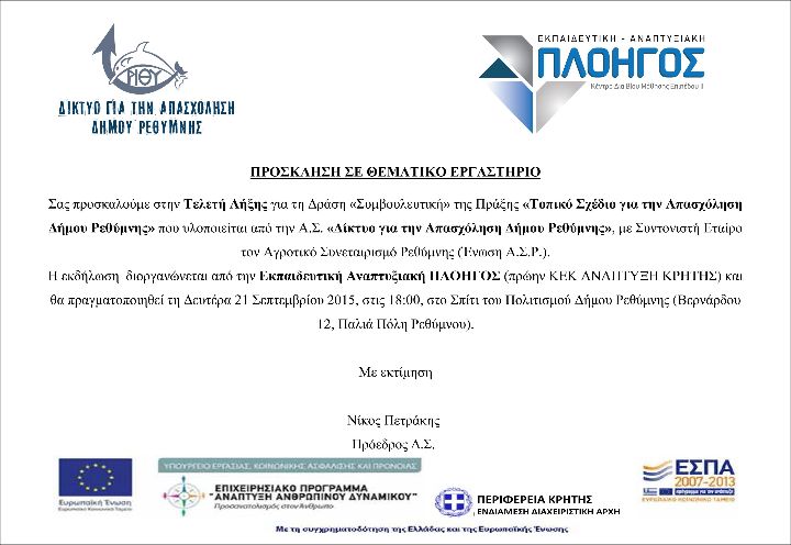 Τελετή Λήξης για τη Δράση της Συμβουλευτικής διοργανώνει η Εκπαιδευτική-Αναπτυξιακή ΠΛΟΗΓΟΣ (πρώην ΚΕΚ ΑΝΑΠΤΥΞΗ ΚΡΗΤΗΣ) στο πλαίσιο της Πράξης «Τοπικό Σχέδιο για την Απασχόληση Δήμου Ρεθύμνης» που υλοποιείται από την Α.Σ. «Δίκτυο για την Απασχόληση Δήμου Ρεθύμνης».