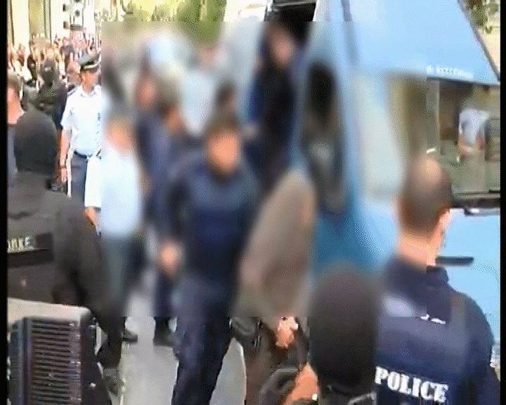 Τα οκτώ άτομα έφτασαν στα Δικαστήρια που είχαν "ζωστεί" από ισχυρές αστυνομικές δυνάμειες ,λίγα λεπτά μετά τις 6 το απόγευμα Ηρακλείου προκειμένου να παρουσιαστούν ενώπιον του Εισαγγελέα .