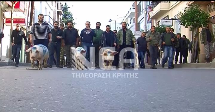 Έτσι, πέρα από τον αποκλεισμό της εφορίας με τρακτέρ, οι αγρότες έβγαλαν το πρωί στους κεντρικούς δρόμους του Ρεθύμνου και τρία γουρούνια βαμμένα στα χρώματα των κομμάτων που κυβέρνησαν τα τελευταία 40 χρόνια την Ελλάδα.