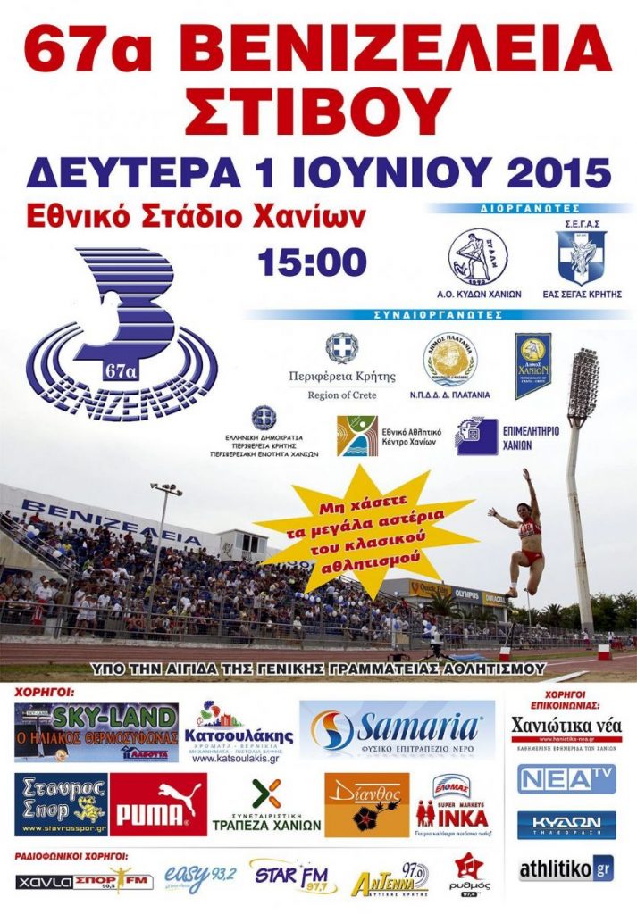 Με την συνδιοργάνωση της Περιφέρειας Κρήτης, και της Περιφερειακής Ενότητας Χανίων θα πραγματοποιηθούν την Δευτέρα 1 Ιουνίου 2015 τα 67α Βενιζέλεια Στίβου στις 3 μ.μ. στο Εθνικό Στάδιο Χανίων με συμμετοχές αθλητών από Ελλάδα, Κύπρο, Βουλγαρία, Ρουμανία και Αλβανία.