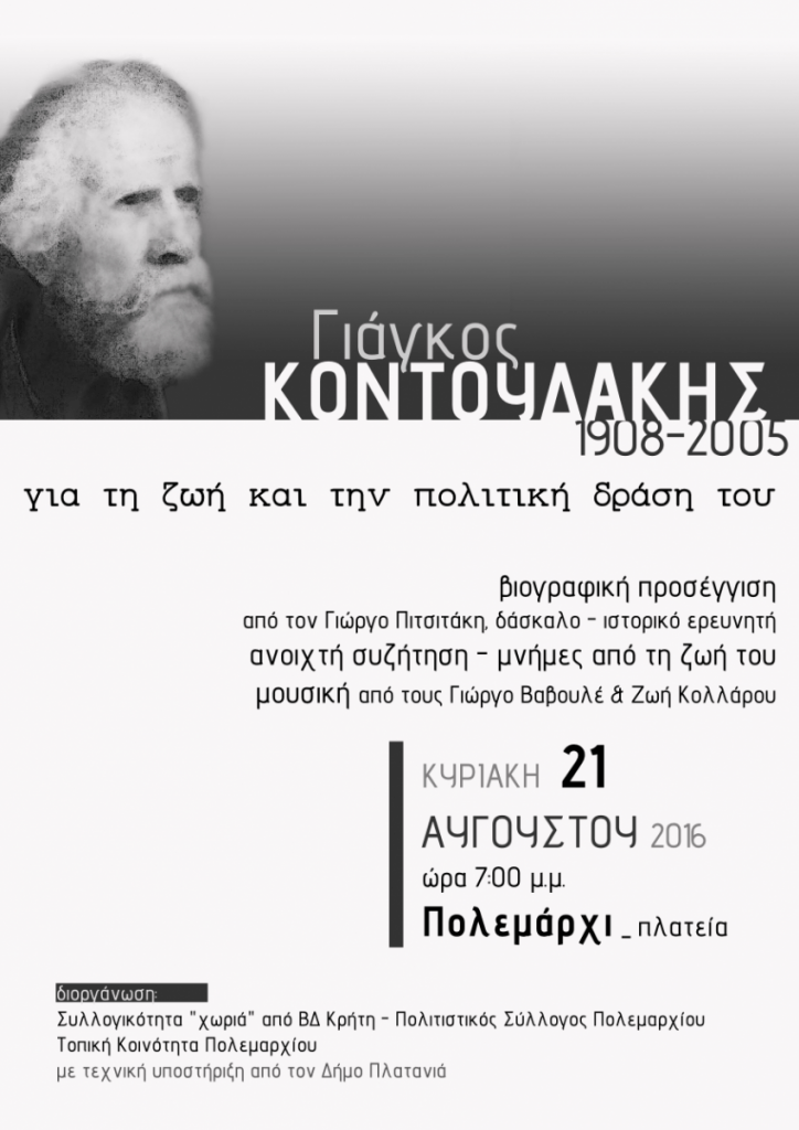 Την Κυριακή 21 Αυγούστου στις 7 μ.μ. στην πλατεία του χωριού του, στο Πολεμάρχι, θα τιμήσουμε τον συγχωριανό μας, αγωνιστή της Αντίστασης και των κοινωνικών αγώνων, Γιάννη (Γιάγκο) Κοντουδάκη.