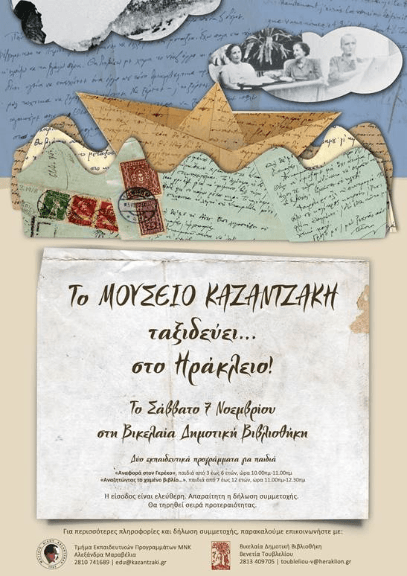 Το Σάββατο 7 Νοεμβρίου, το ΜΝΚ θα βρίσκεται στο κτίριο της Βικελαίας (Ταξιάρχου Μαρκοπούλου 46) και προσκαλεί παιδιά και γονείς να ανακαλύψουν τον Νίκο Καζαντζάκη με αφορμή τα προσωπικά του αντικείμενα, τις οικογενειακές φωτογραφίες και τα βιβλία του.