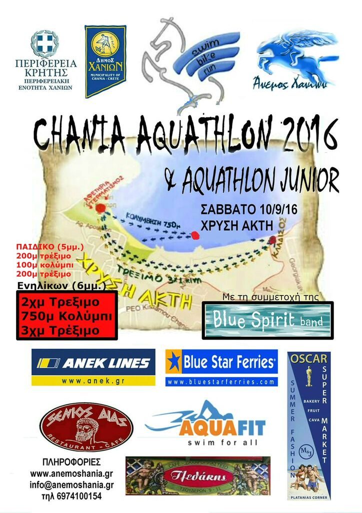 Η Περιφερειακή Ενότητα Χανίων, ο Δήμος Χανίων και ο Α.Π.Σ. » Άνεμος» θα διοργανώσουν αγώνα ερασιτεχνικού χαρακτήρα, συνδυασμού των αθλημάτων κολύμβησης-τρεξίματος «2ο Chania Aquathlon 2016» το Σάββατο 10/9/16 και ώρα 18.00 (ενηλίκων). Ο αγώνας θα περιλαμβάνει 2χμ τρέξιμο στην παραλία, 750μ κολύμπι και 3 χμ τρέξιμο σε χώμα., ενώ μια ώρα νωρίτερα (17.00) θα διεξαχθεί παιδικός αγώνας με μικρότερες αποστάσεις.