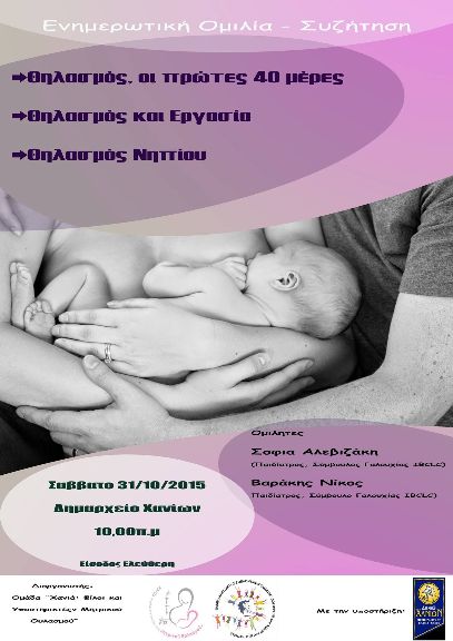 Στο πλαίσιο του εορτασμού της εβδομάδας Μητρικού Θηλασμού, η εθελοντική ομάδα “Χανιά: Φίλοι και Υποστηρικτές Μητρικού Θηλασμού”, που ανήκει στο Πανελλήνιο Δίκτυο Εθελοντικών Ομάδων Μητρικού Θηλασμού κ Μητρότητας, διοργανώνει ομιλία με την Κα Σόφη Αλεβιζάκη, Παιδίατρο, Σύμβουλο Γαλουχίας IBCLC και τον Κο Βαράκη Νίκο, Παιδίατρο , Σύμβουλο Γαλουχίας IBCLC με θέματα :