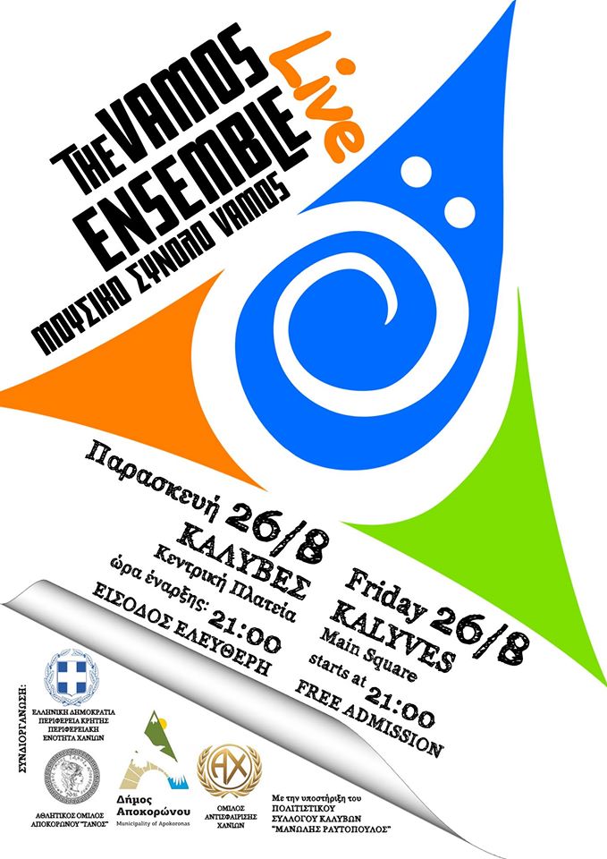 Στο πλαίσιο διεξαγωγής του Διεθνούς Σκακιστικού τουρνουά "ΑΠΟΚΟΡΩΝΑΣ 2016", η Περιφέρεια Κρήτης-Περιφερειακή Ενότητα Χανίων, ο Δήμος Αποκορώνου, ο Όμιλος Αντισφαίρισης Χανίων, ο Α.Ο. "ΤΑΝΟΣ", ο Πολιτιστικός Σύλλογος Καλυβών "Μανώλης Ραυτόπουλος", σε συνεργασία με το Μουσικό Σύνολο "VAMOS ENSEMBLE", διοργανώνουν Συναυλία, την Παρασκευή 26 Αυγούστου 2016 και ώρα 9:00, στην πλατεία των Καλυβών.