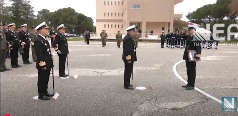 Αλλαγή σκυτάλης στο Ναύσταθμο Κρήτης, με τον νέο Διοικητή Αρχιπλοίαρχο Διονύση Μανταδάκη να παραλαμβάνει από τον υποναύαρχο Βασίλειο Τσούκα.
