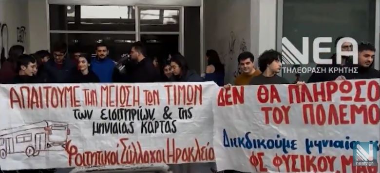 Συγκέντρωση διαμαρτυρίας πραγματοποίησαν οι φοιτητές στο Ηράκλειο έξω από το αστικό ΚΤΕΛ, ζητώντας από την Περιφέρεια και την Πρυτανεία Κρήτης, αλλά και από τον Δήμο Ηρακλείου να παρέμβουν, ώστε να μειωθεί το αντίτιμο της κάρτας απεριορίστων διαδρομών.