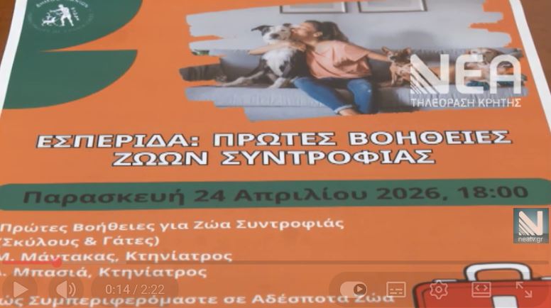 Ο Δήμος Χανίων, την Παρασκευή 24 Απριλίου, στις 6.00μμ, διοργανώνει εσπερίδα σχετικά με το πώς μπορούμε να παρέχουμε πρώτες βοήθειες στα ζώα συντροφιάς.