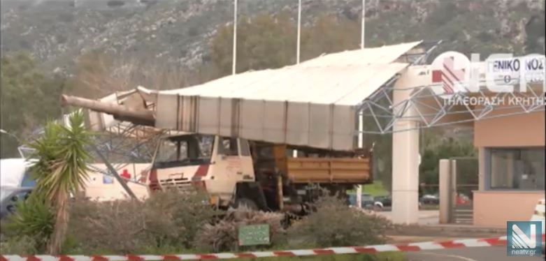 Βίντεο – Γερανοφόρο παρέσυρε το στέγαστρο της πύλης του ΓΝΧ