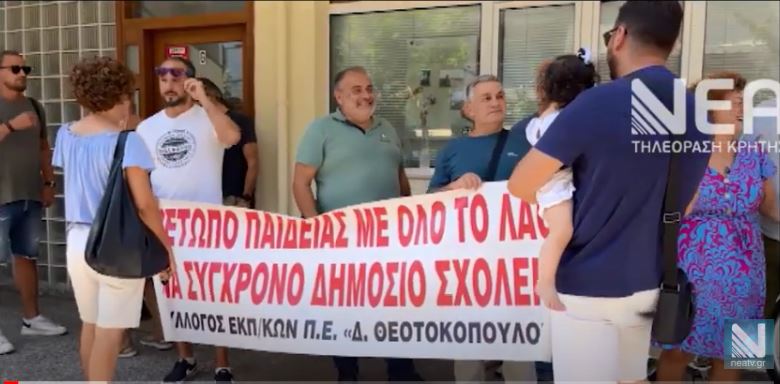 Παγκρήτια διαμαρτυρία πραγματοποίησαν το πρωί, οι εκπαιδευτικοί της Πρωτοβάθμιας, έξω από τα γραφεία της Περιφερειακής Διεύθυνσης Εκπαίδευσης, στο Ηράκλειο, ενάντια στις συγχωνεύσεις.