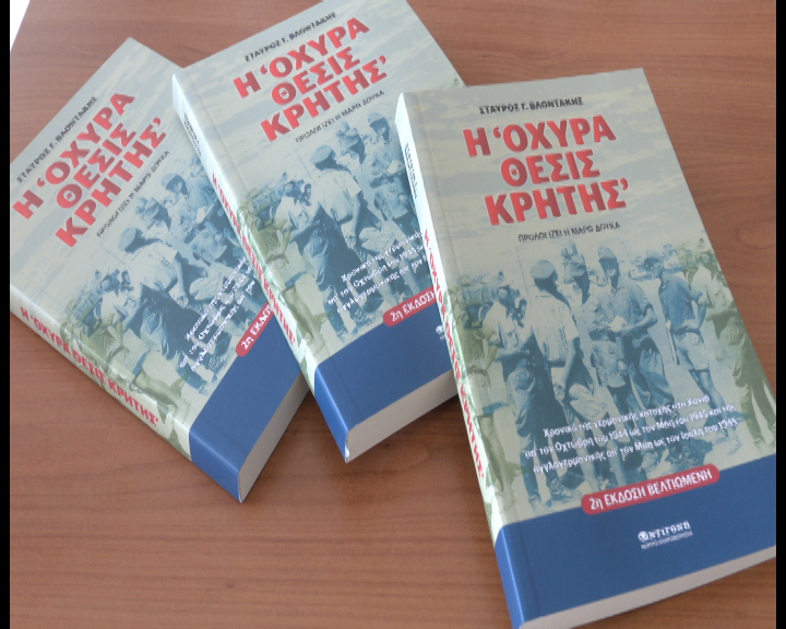 Την περίοδο των επτά μηνών που ένα κομμάτι του βόρειου τμήματος των Χανιών παρέμενε υπό γερμανική κατοχή παρά το γεγονός ότι τα στρατεύματα είχαν αποχωρήσει από την υπόλοιπη Κρήτη πραγματεύεται το βιβλίο με τίτλο “Οχυρά Θέσις Κρήτης” του Σταύρου Γ. Βλοντάκη. Το βιβλίο που παρουσιάστηκε χθες στο Πνευματικό κέντρο Χανίων , είναι αποτέλεσμα εμπεριστατωμένης ιστορικής έρευνας, διανθισμένο με την αφήγηση πολλών χαρακτηριστικών περιστατικών που βίωσε ο ίδιος συγγραφέας.