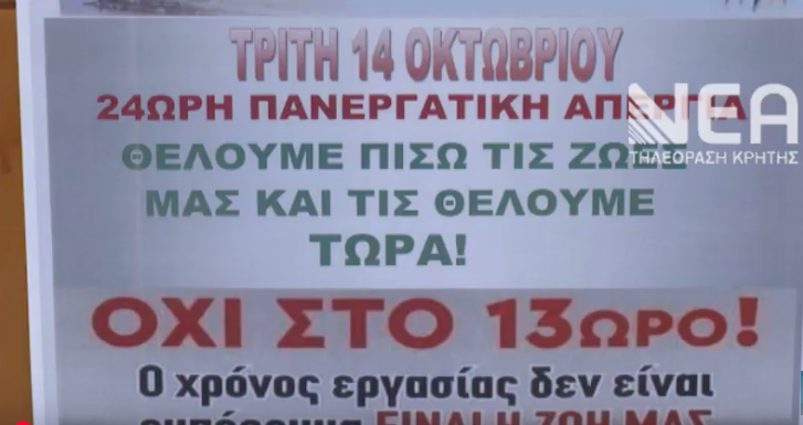 Με αιτήματα για απόσυρση των ρυθμίσεων για το 13ωρο, αυξήσεις στους μισθούς και σεβασμό στα εργασιακά δικαιώματα η χώρα εισέρχεται αύριο Τρίτη 14 Οκτωβρίου σε κλοιό κινητοποιήσεων με 24ωρη πανελλαδική απεργία . ΑΔΕΔΥ και ΓΣΕΕ αντιδρούν στο νέο εργασιακό νομοσχέδιο του υπουργείου Εργασίας με συλλαλητήρια στις μεγάλες πόλεις .Στα Χανιά η κινητοποίηση θα πραγματοποιηθεί στις 10 το πρωί στην Δημοτική Αγορά.